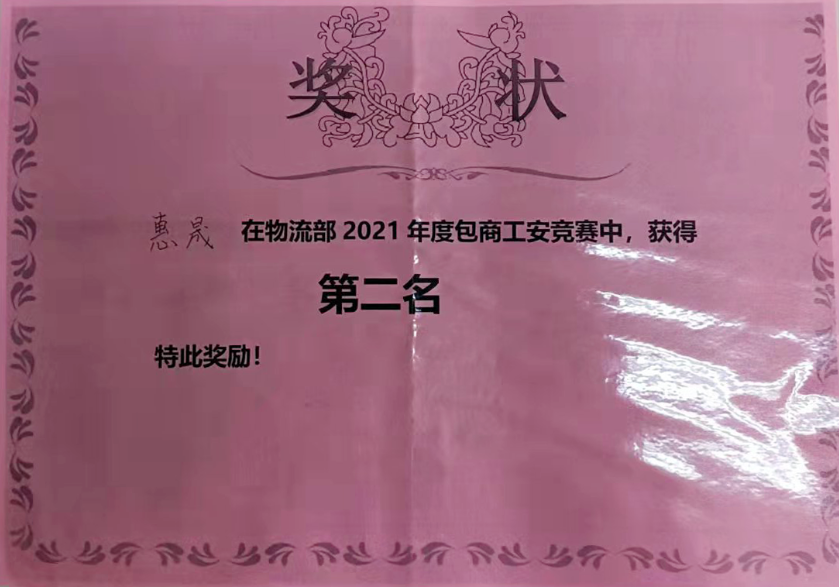 為檢驗包商團隊整體業務能力和服務水平,強化安全責任意識,2022年1月12日,客戶舉辦2021年度包商工安競賽,經過評委綜合評分,我們上海惠晟物流鎮江分公司獲得了第二名的優異成績!圖片圖片圖片