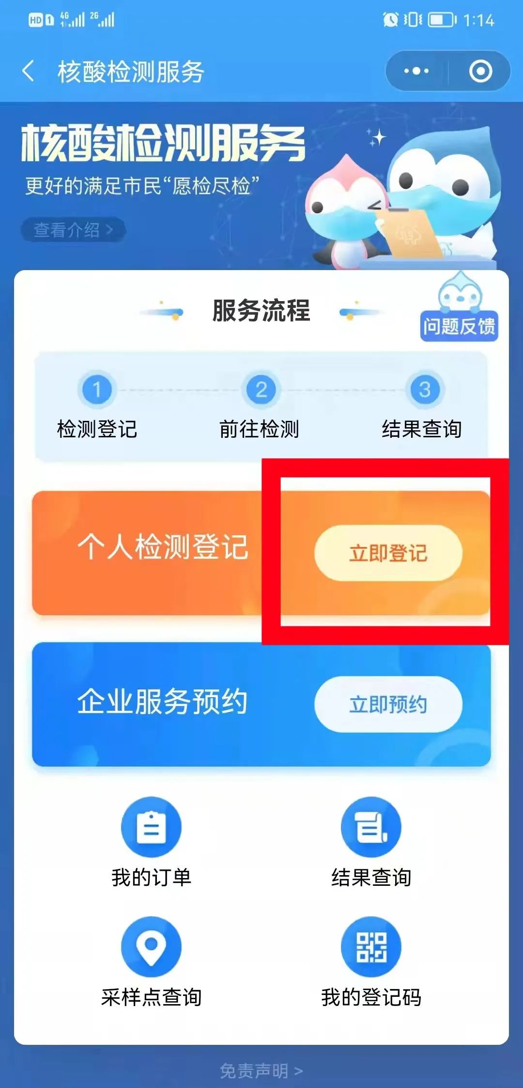 2進入“核酸檢測”服務頁面點擊“立即登記”。