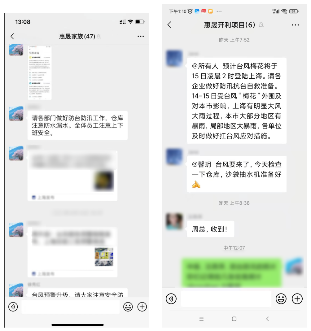 后勤保障部的工作人員也通過線上微信群等多種渠道發布預警通知;暖心的提示,告知惠晟家人們天氣情況和注意事項。